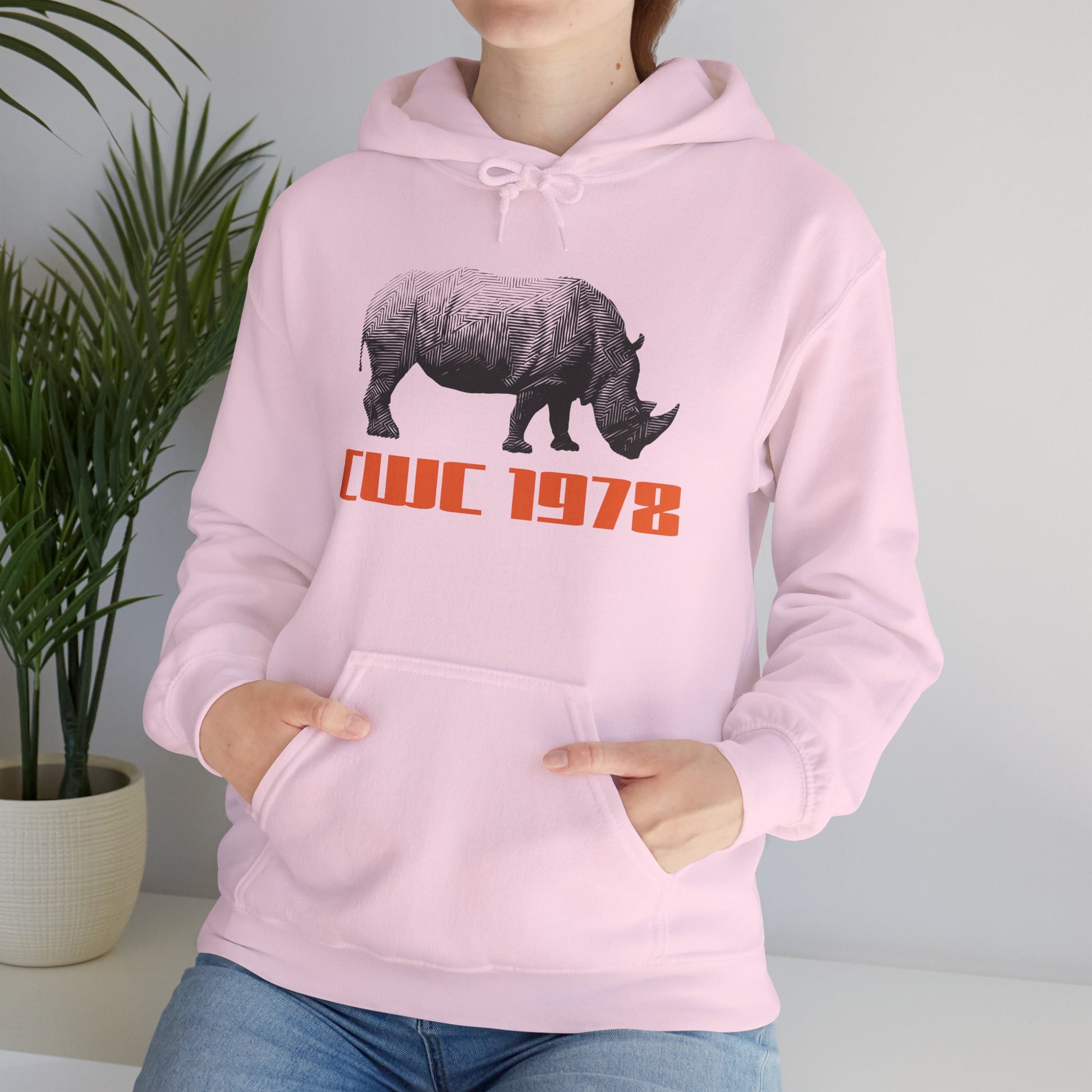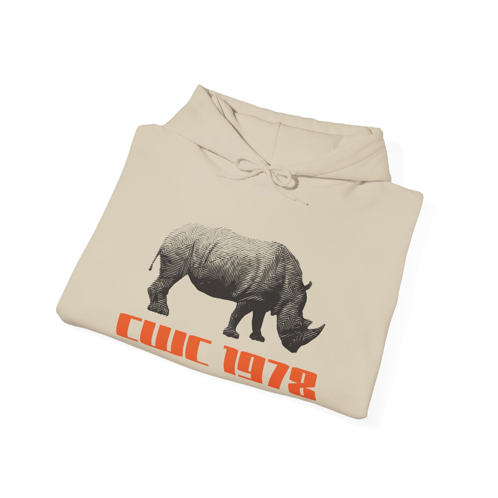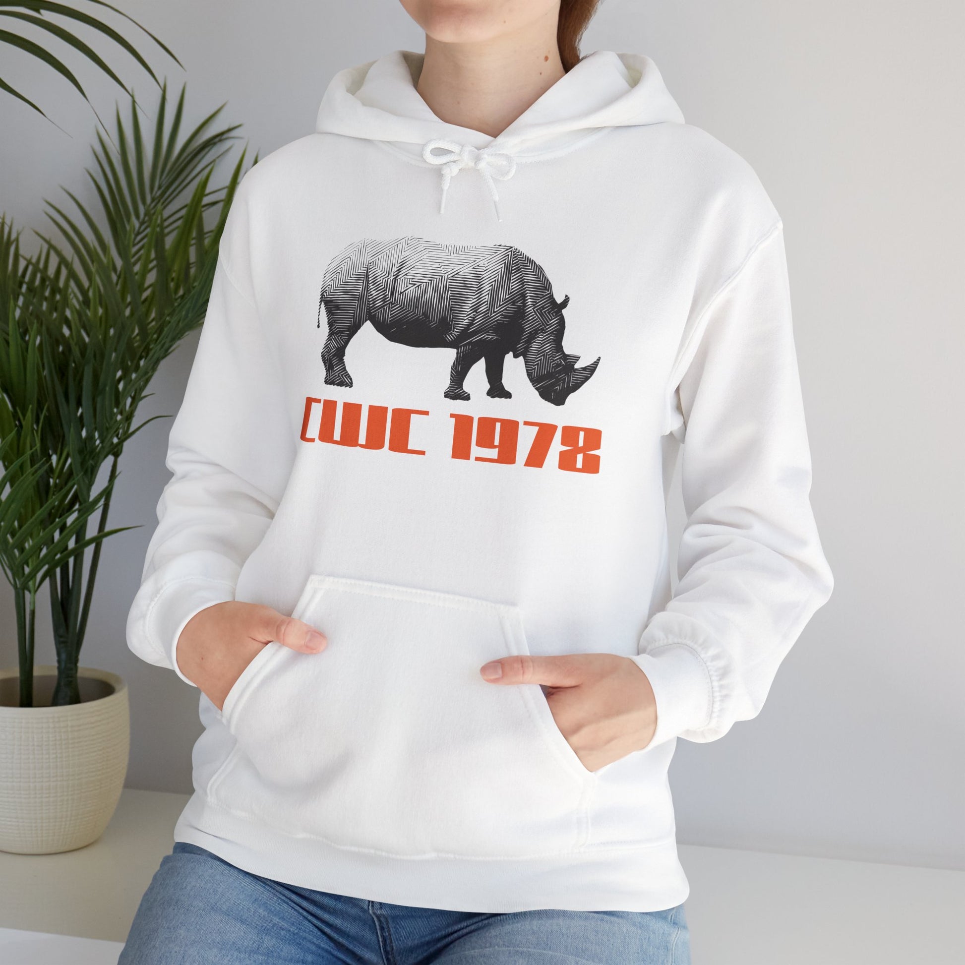 This cozy hooded sweatshirt carries a vintage, wildlife-inspired vibe — a quietly bold rhino sketch sits above blocky retro lettering. It feels like slipping into a familiar jacket you reach for on foggy mornings: substantial weight, soft inside, and a roomy pocket to warm your hands. The slightly weathered print and minimalist palette make it easy to layer over tees or under a coat, whether you’re heading out for a nature walk or settling in with a book. Wear it when you want comfort that quietly states your love of rugged, classic design.