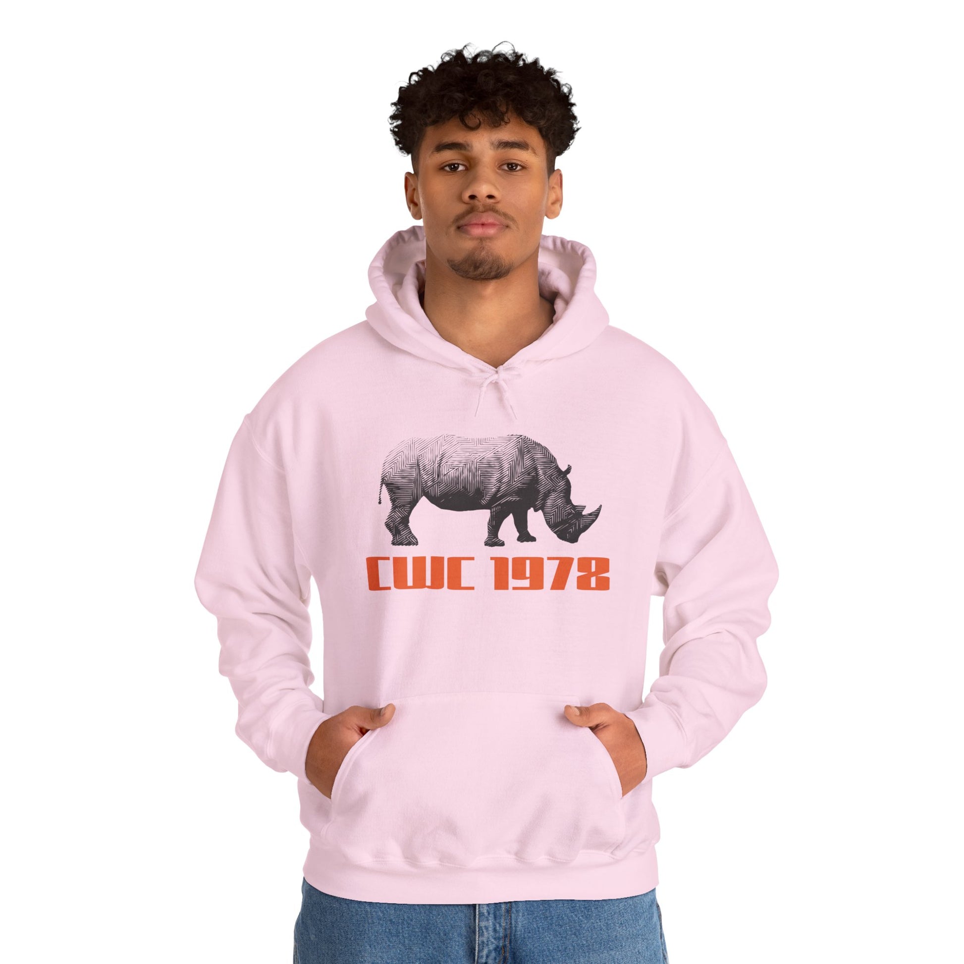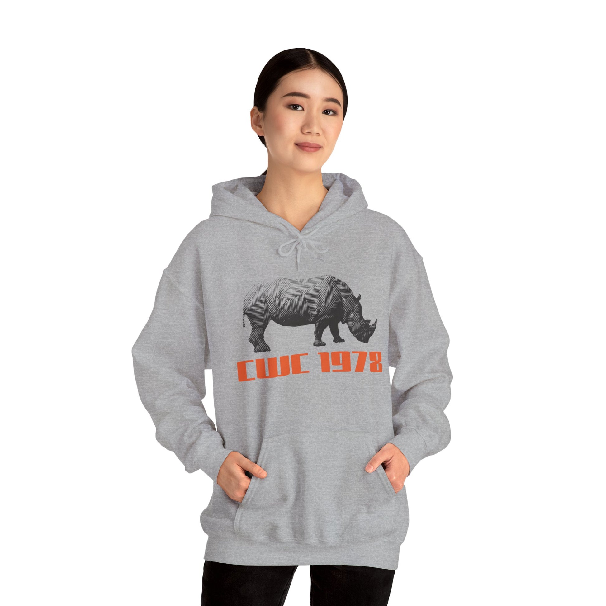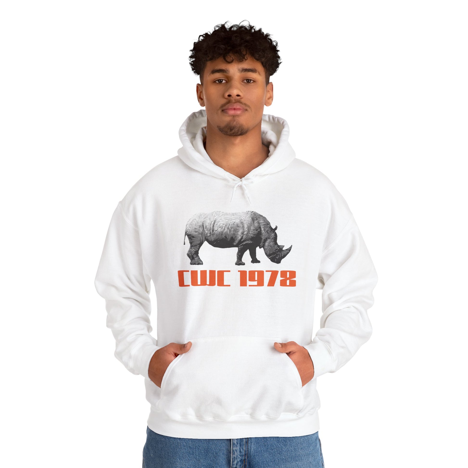 This cozy hooded sweatshirt carries a vintage, wildlife-inspired vibe — a quietly bold rhino sketch sits above blocky retro lettering. It feels like slipping into a familiar jacket you reach for on foggy mornings: substantial weight, soft inside, and a roomy pocket to warm your hands. The slightly weathered print and minimalist palette make it easy to layer over tees or under a coat, whether you’re heading out for a nature walk or settling in with a book. Wear it when you want comfort that quietly states your love of rugged, classic design.