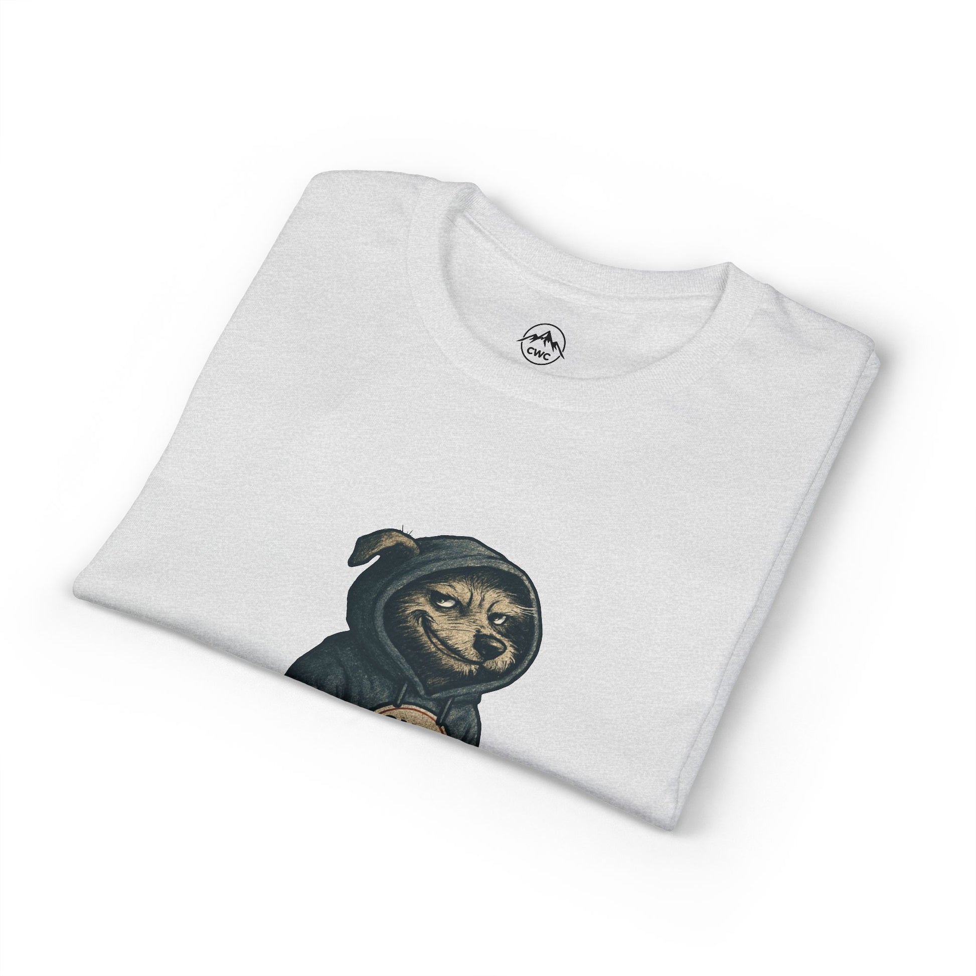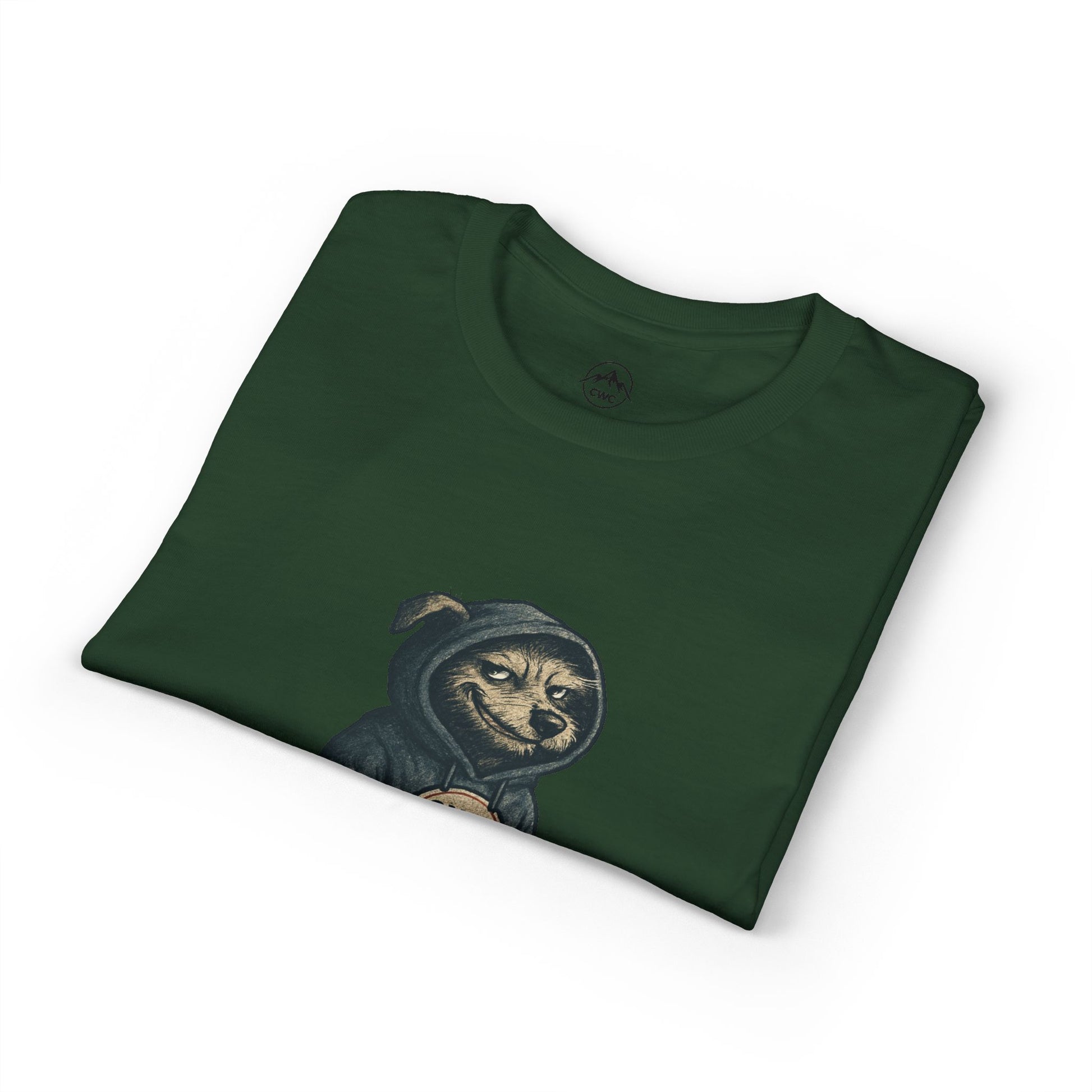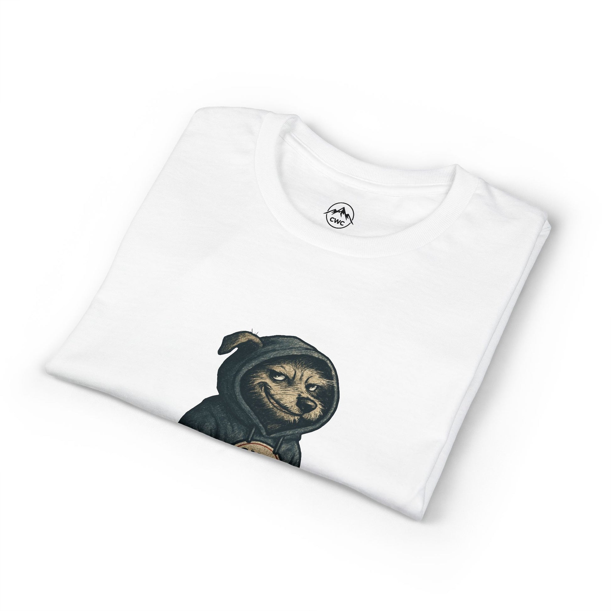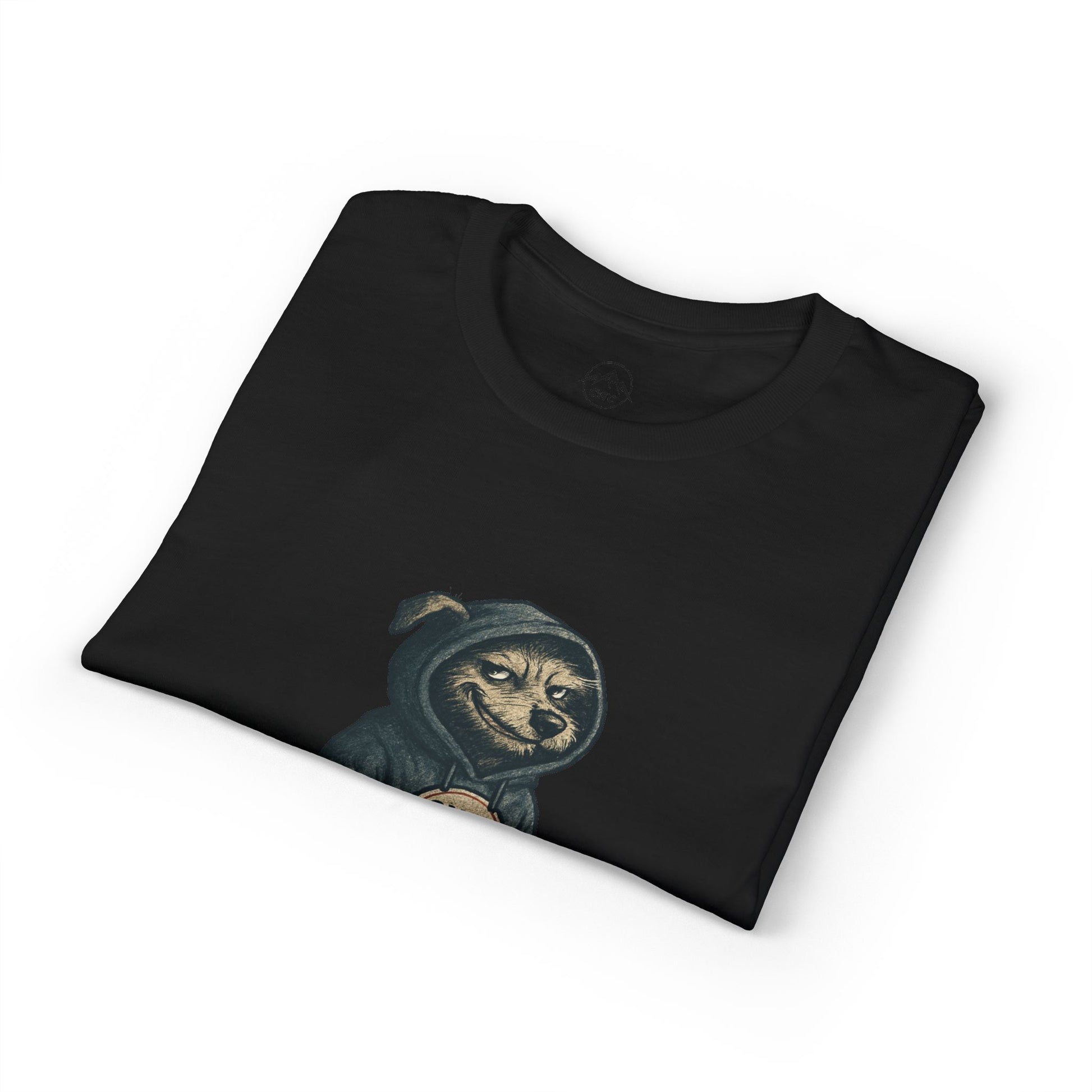 A soft, breathable tee that quietly shows off a sly, streetwise sense of humor. The design centers on a grinning, hoodie-clad pug with a worn emblem — a little bit mischievous, a little protective — placed front-and-center for casual, confident wear. Lightweight but sturdy, the shirt moves easily through daily routines: coffee runs, late-night walks, or relaxed hangouts. It sits comfortably under a jacket or stands alone as the focal point of a simple outfit, letting the artwork do the talking without shouting. The mood is cozy and slightly irreverent — made for people who appreciate low-key attitude and character-driven graphics.