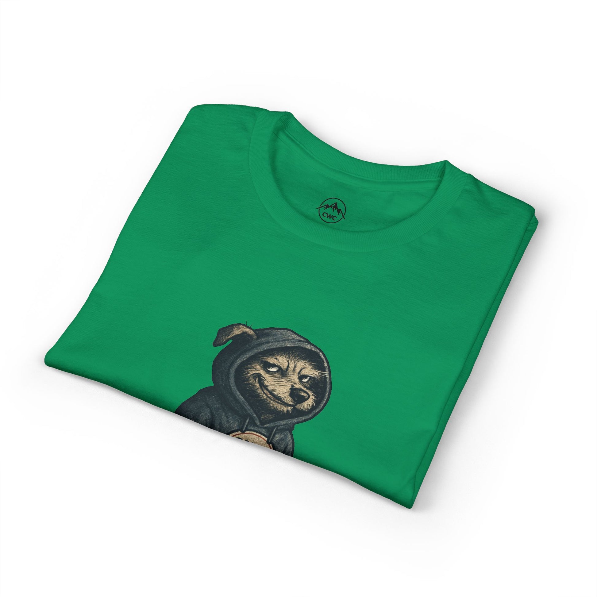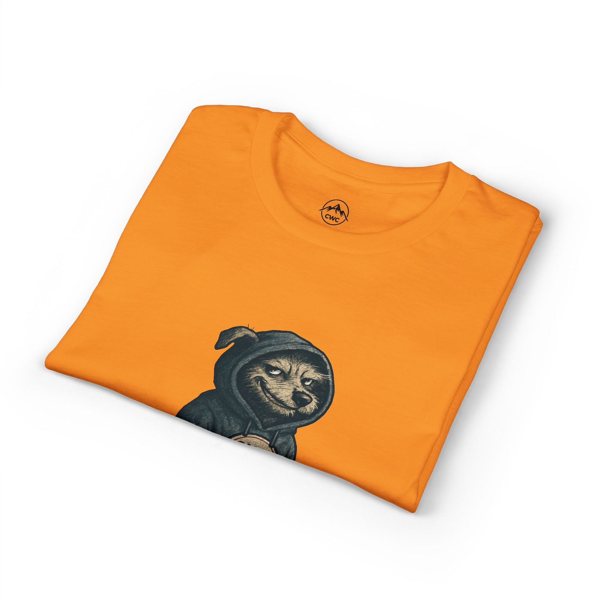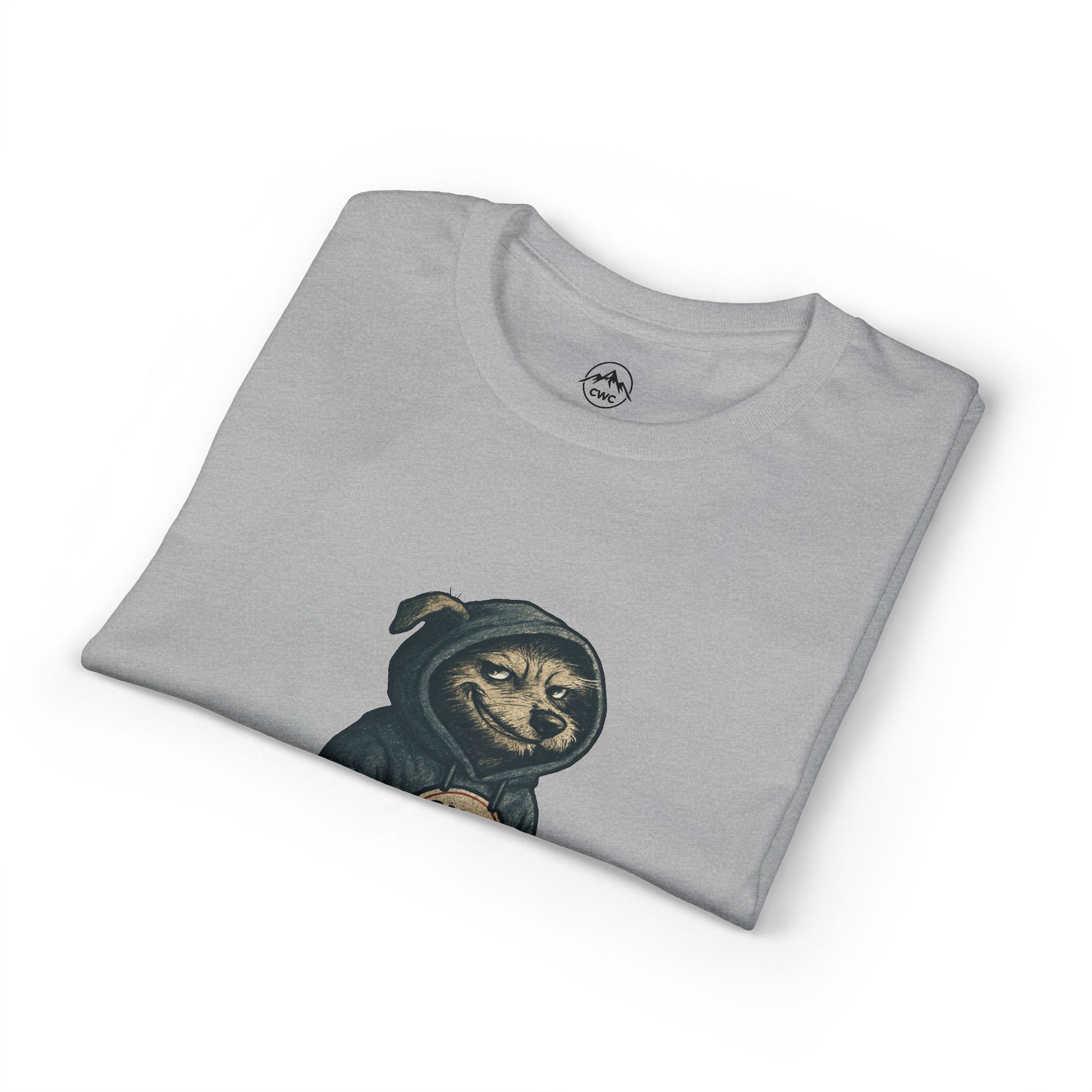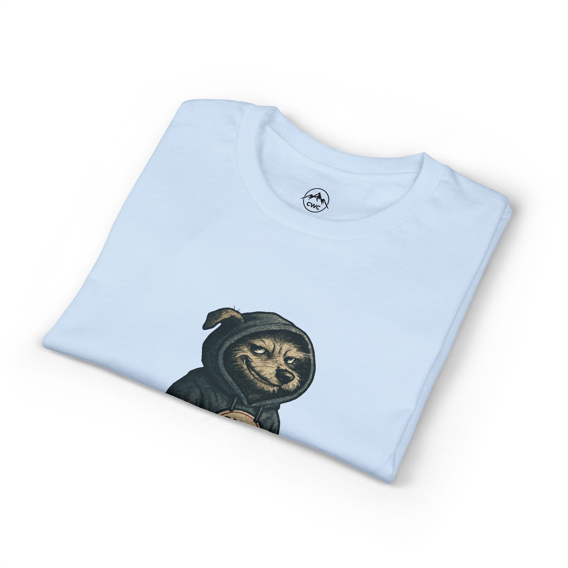 A soft, breathable tee that quietly shows off a sly, streetwise sense of humor. The design centers on a grinning, hoodie-clad pug with a worn emblem — a little bit mischievous, a little protective — placed front-and-center for casual, confident wear. Lightweight but sturdy, the shirt moves easily through daily routines: coffee runs, late-night walks, or relaxed hangouts. It sits comfortably under a jacket or stands alone as the focal point of a simple outfit, letting the artwork do the talking without shouting. The mood is cozy and slightly irreverent — made for people who appreciate low-key attitude and character-driven graphics.