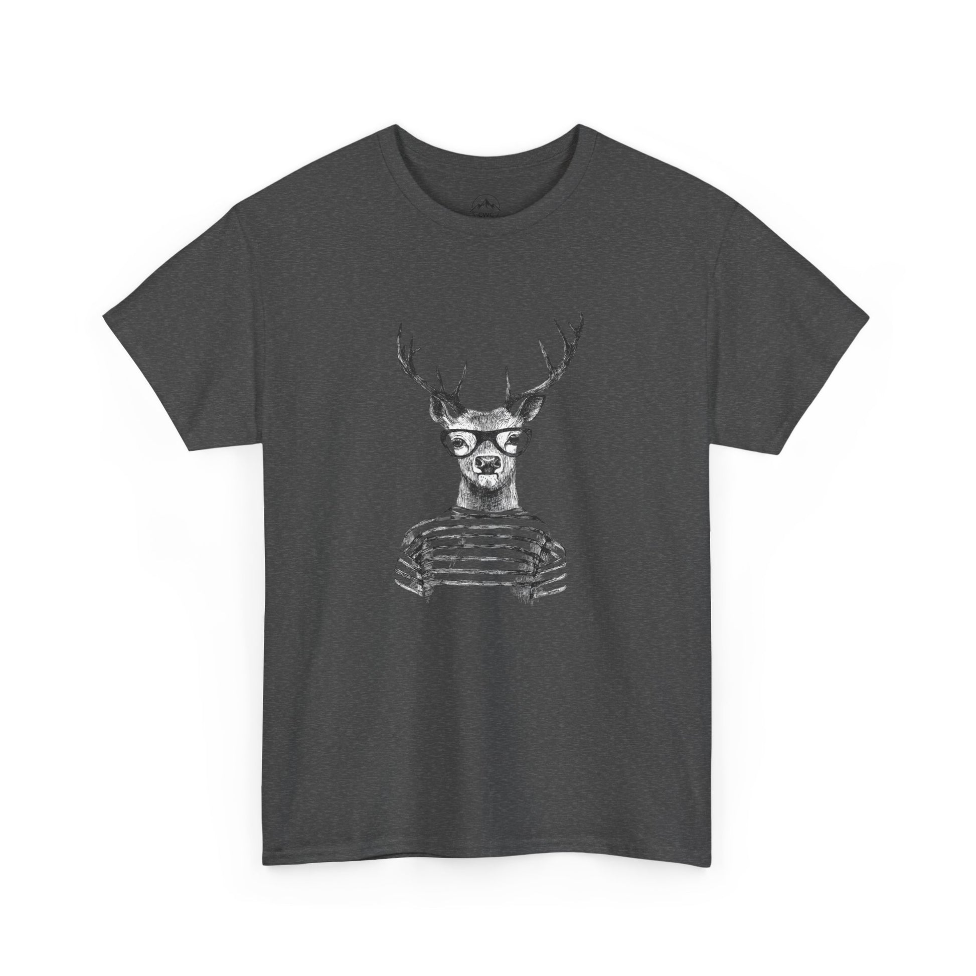 A relaxed, artful tee that feels like a small, personal story you can wear. The soft, mid-weight cotton sits comfortable on the shoulders while the hand-drawn stag illustration — glasses, striped shirt, and all — brings a quiet, playful charm to everyday outfits. It’s for people who notice little details: cozy coffee shops, weekend bookshop runs, or slow weekend walks through parks. The classic crew neck and clean silhouette make it easy to layer under a cardigan or pair with jeans. Subtle but memorable, this shirt blends effortless comfort with a touch of whimsy.